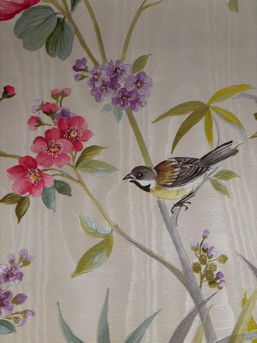 Dit sfeervolle vliesbehang van A.S. Creation combineert elegante bloemen met sierlijke vogels op een zachte beige achtergrond. Het verfijnde dessin brengt een natuurlijke en rustgevende uitstraling in de ruimte en zorgt voor een warme, uitnodigende sfeer.
