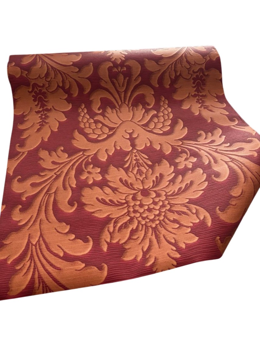 De diepe rode achtergrond in combinatie met de glanzende koperachtige accenten zorgt voor een warme en elegante sfeer. Ideaal om een statement wall te creëren of een ruimte een chique en sfeervolle make-over te geven.